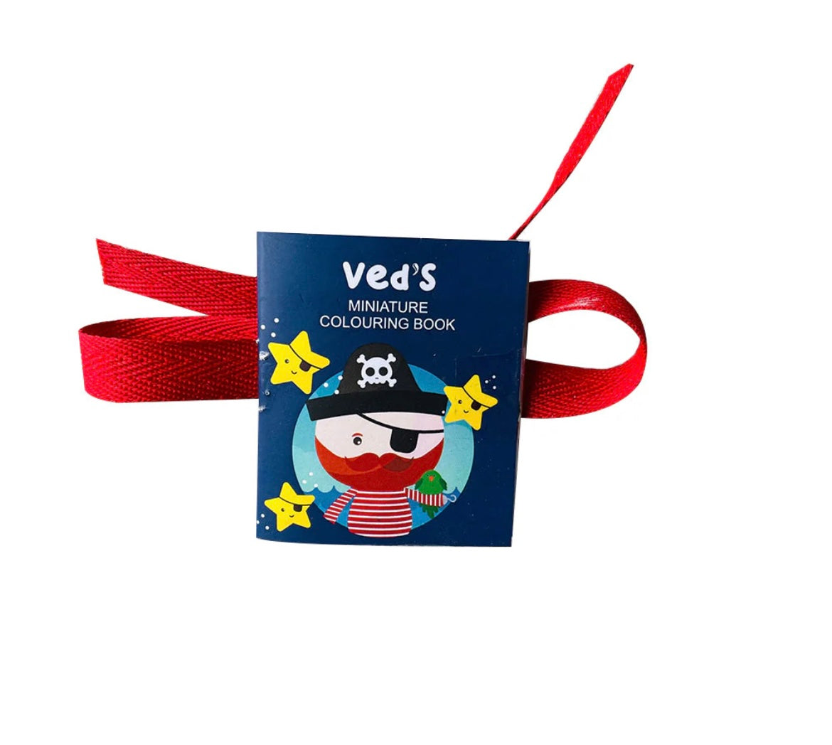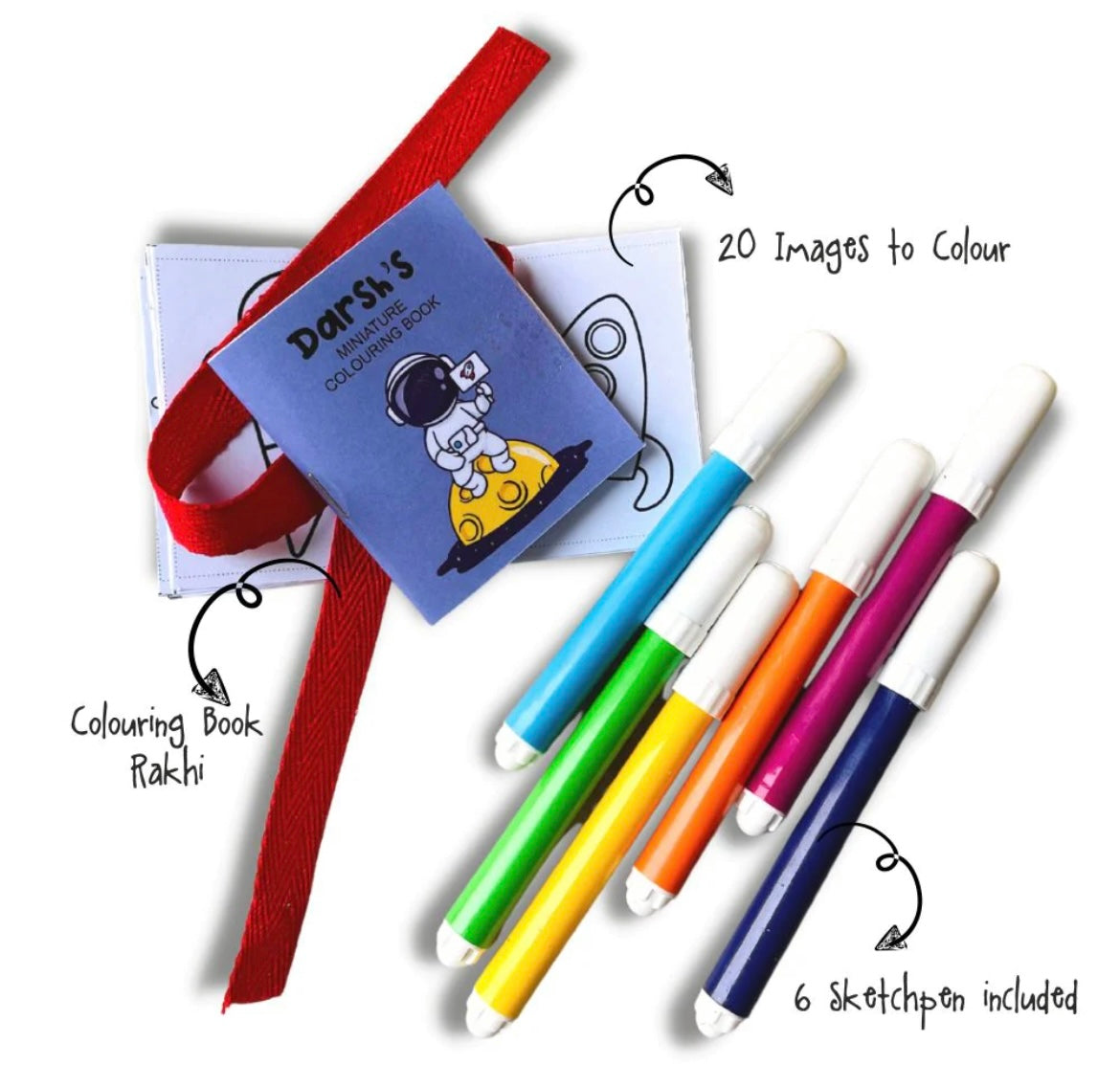 This rakhi contains a miniature coloring book with 20 colouring sheets. The kit contains 6 sketchpens to color also.