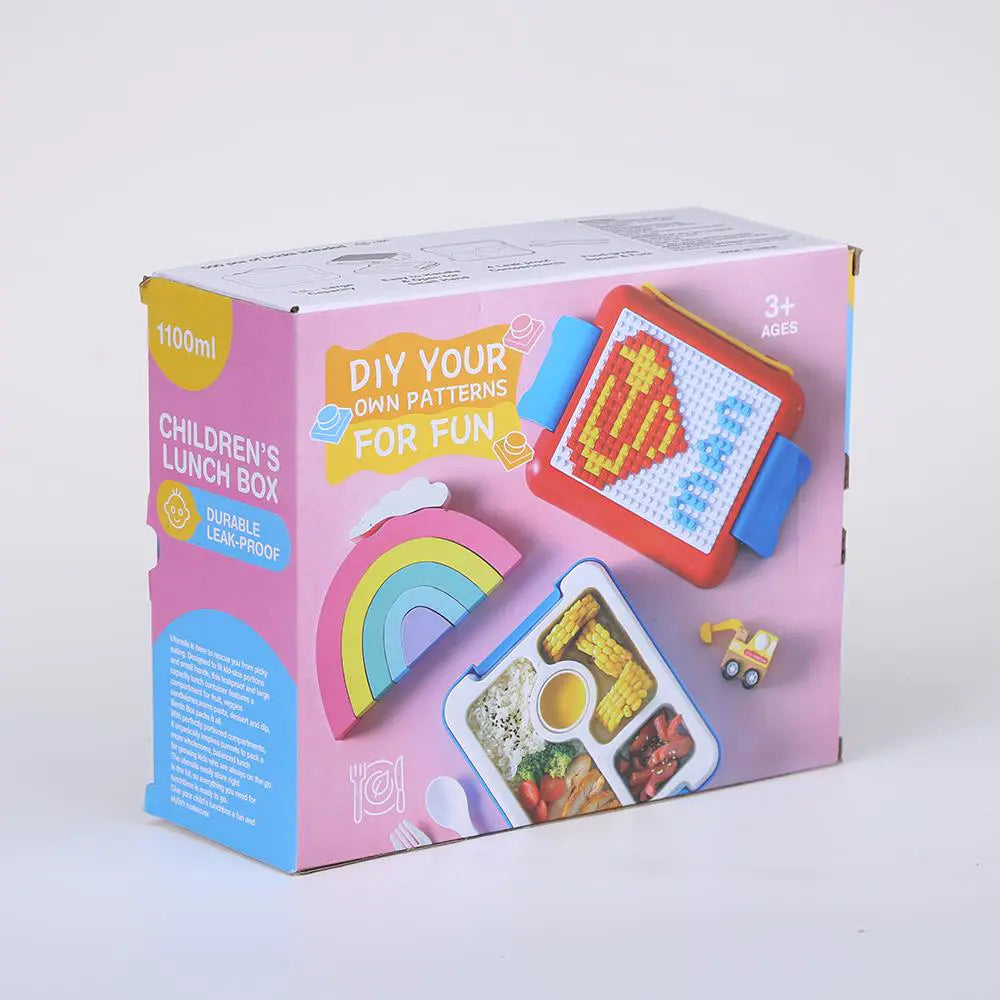 Lunch Box Features a 4 Compartment Design with a Dipping Box, a Sturdy Handle, a Leak-Proof Lid with a Silicone Ring, Microwave & Refrigerator Compatibility & a lid that Doubles as a Building Block Surface for Added Entertainment. It's an Ideal Choice for Convenient & Enjoyable Mealtimes.