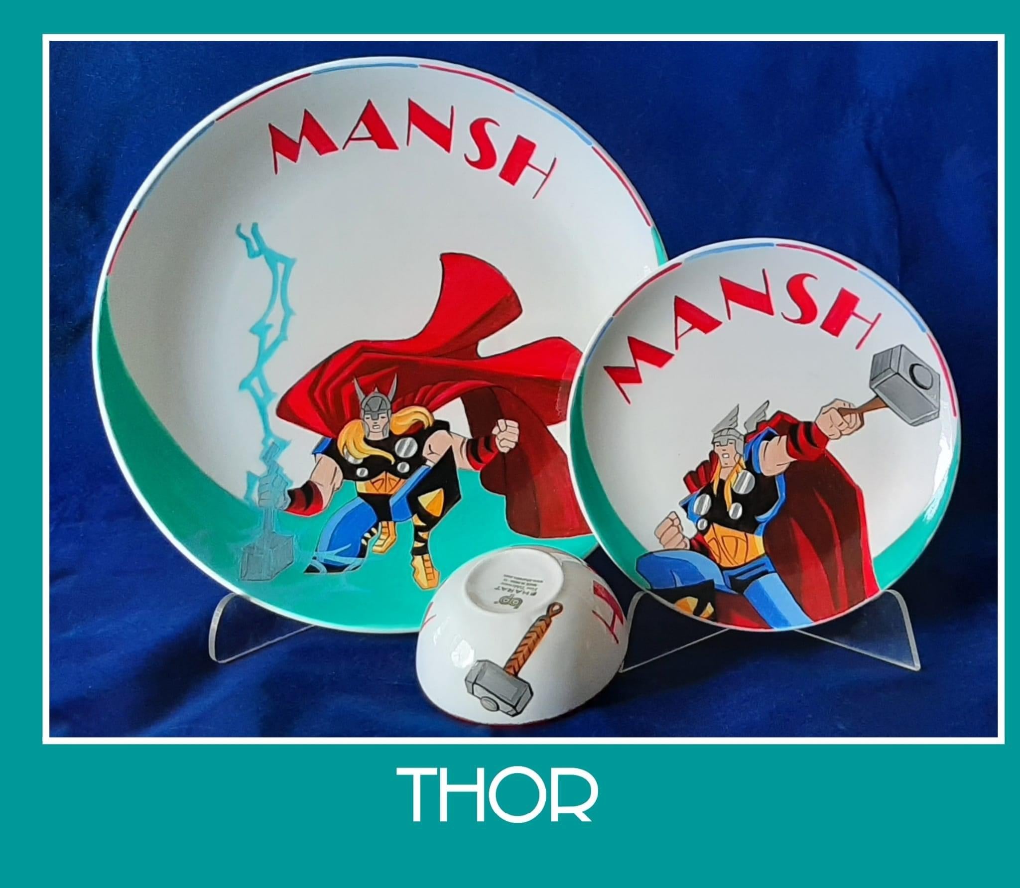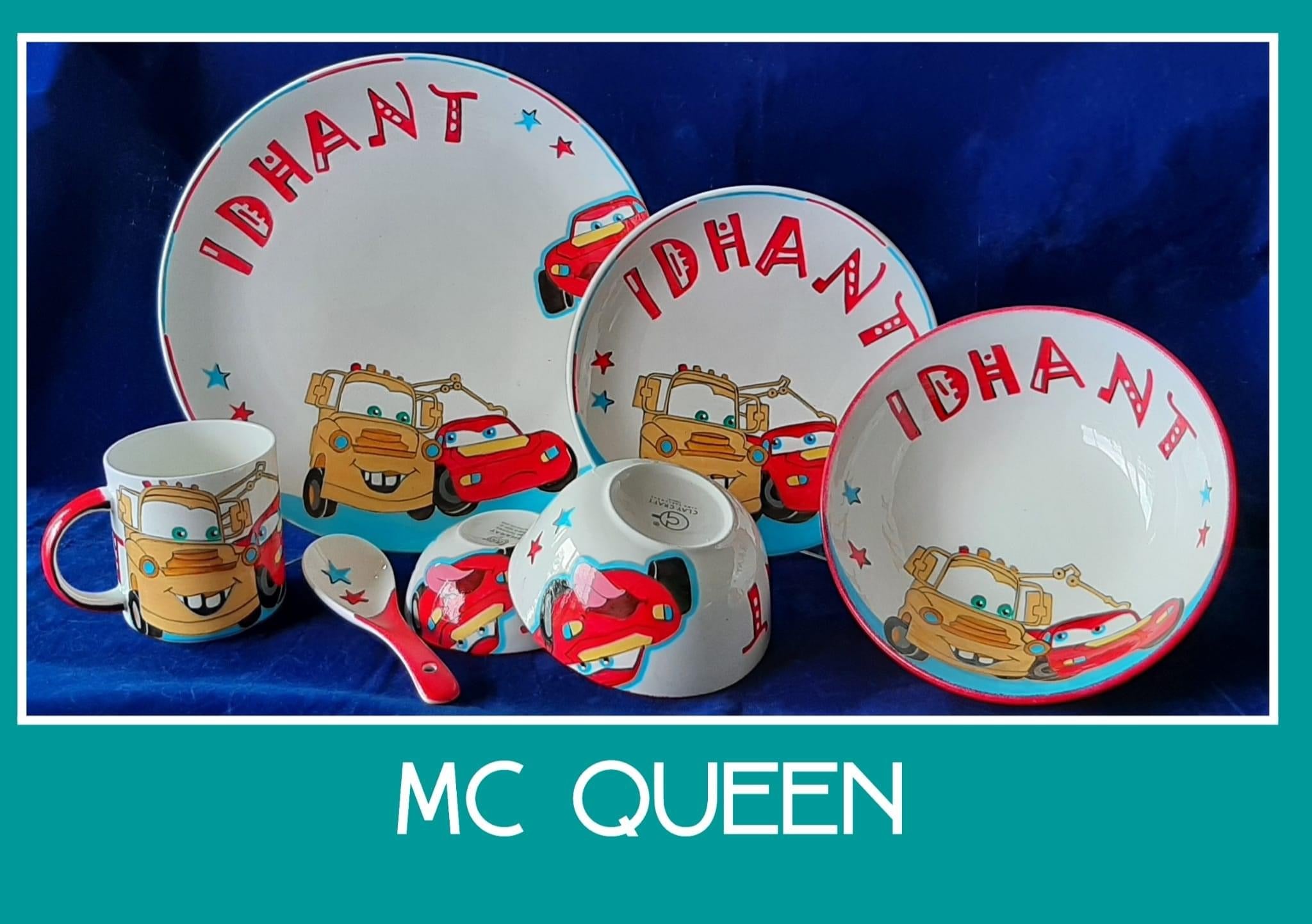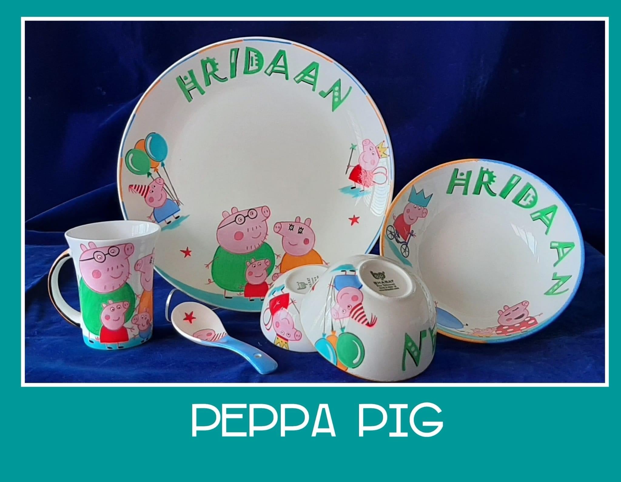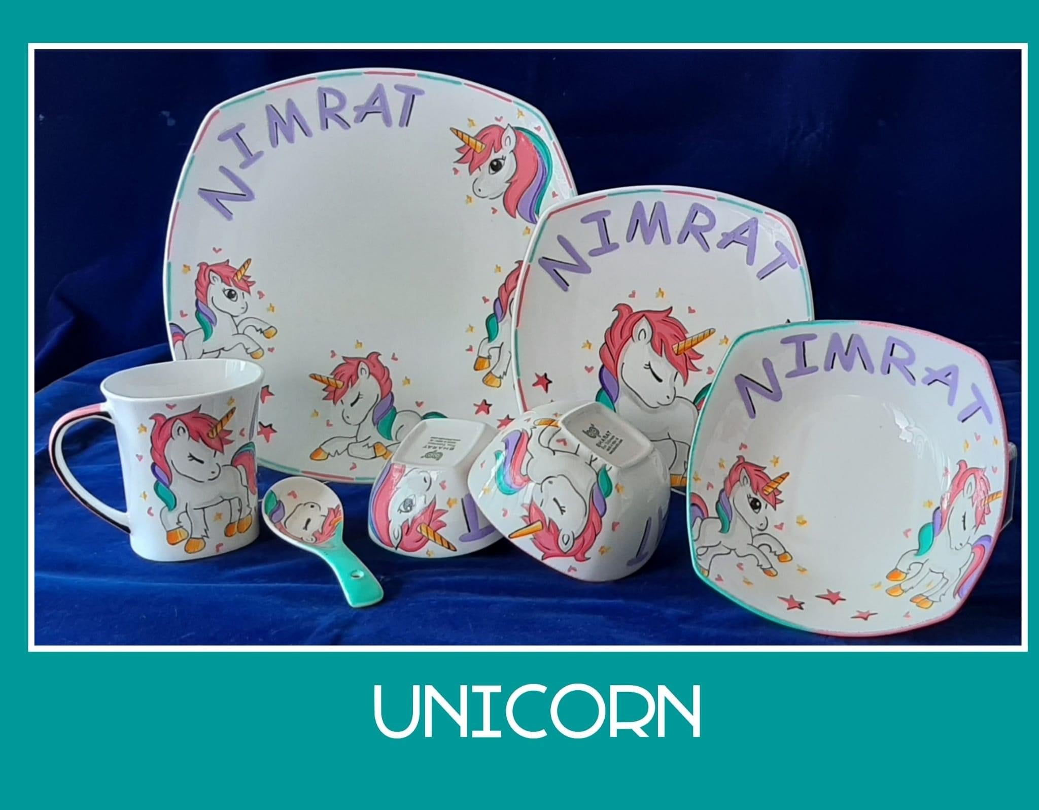 Order this exquisite set for a child & watch meal times become super easy & fun!Hand painted by an artist, this crockery set is personalised with the child's favourite theme & their name