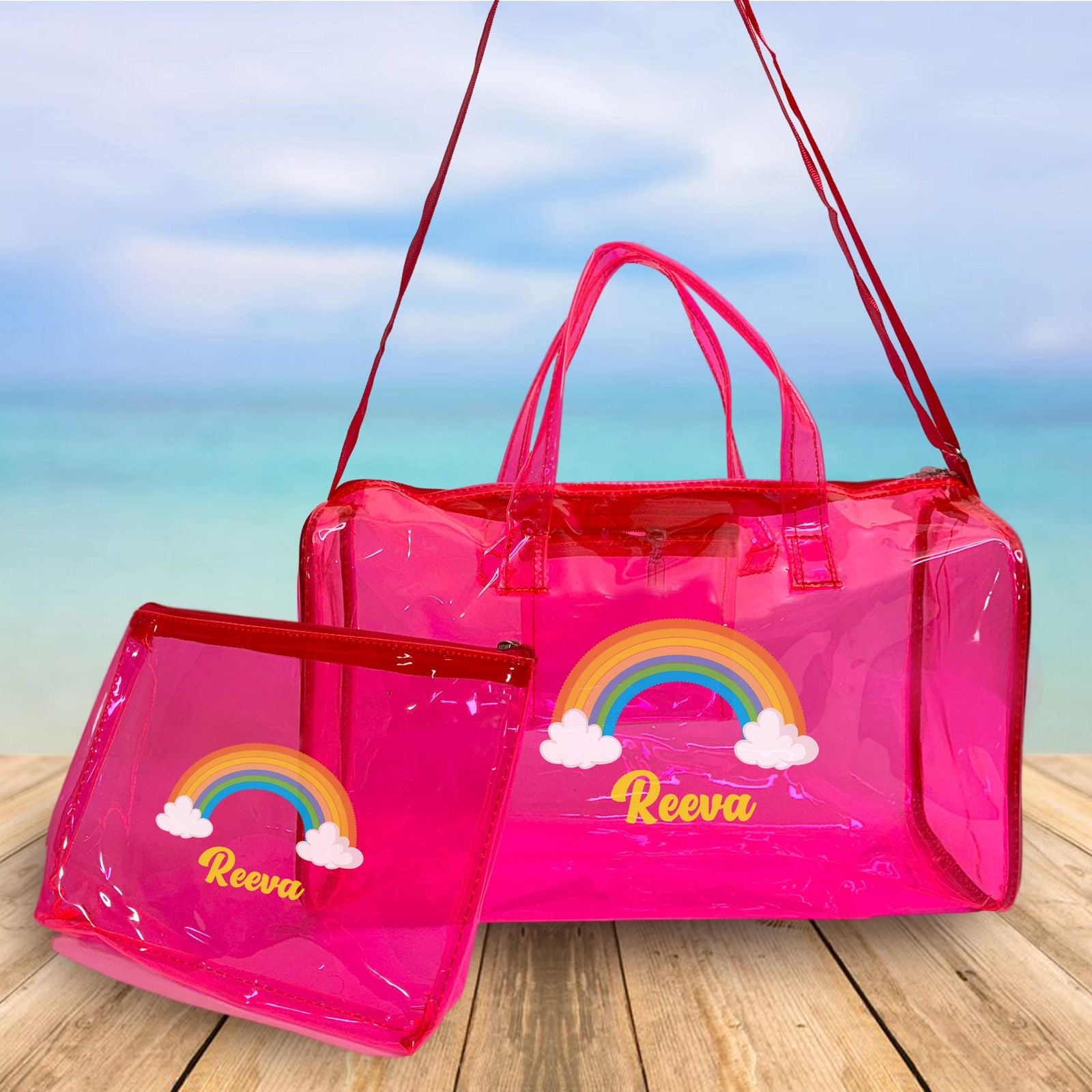 the ultimate duo for style and practicality! Whether it's school, playdates, travel, or outdoor fun, this vibrant combo is the perfect way to keep all your child's essentials organized. The spacious duffle bag offers plenty of room for larger items, while the matching pouch is ideal for smaller belongings like pens, snacks, or toys. Made from durable, lightweight jelly material, both pieces are easy to carry and built to last. Plus, personalize them with your child’s name and design, so they can truly make it their own. A fun, trendy, and versatile set that’s sure to be your little one’s go-to for every adventure!