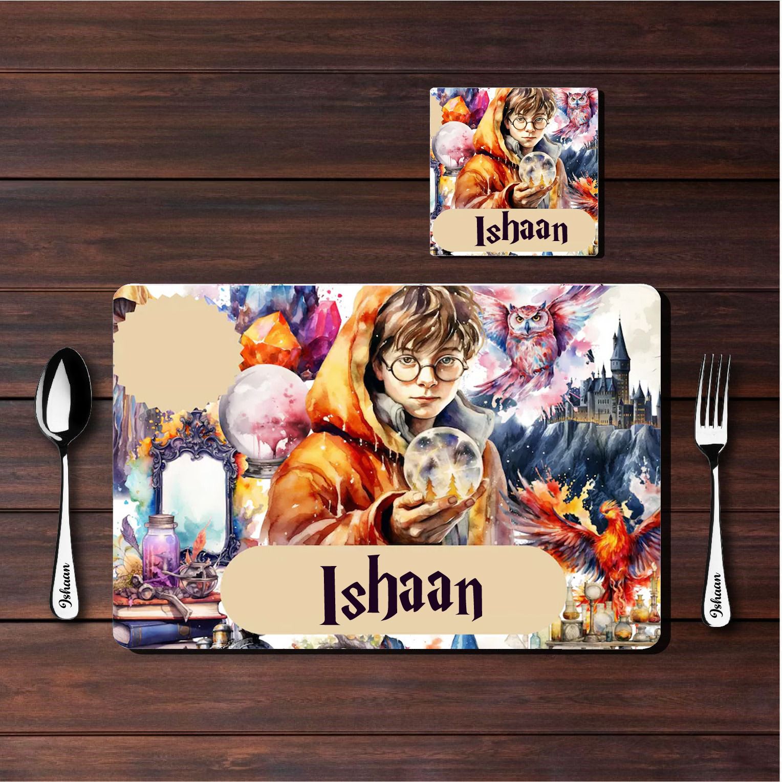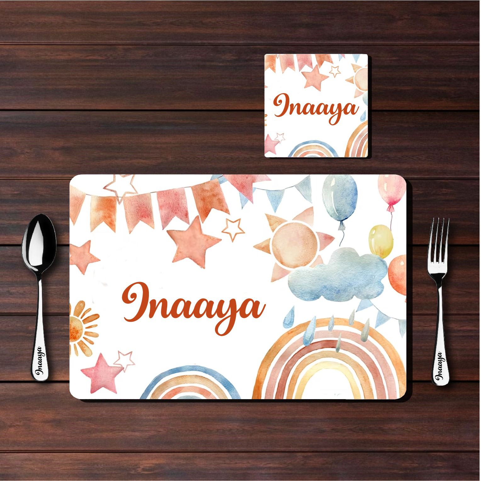 Make your meal time more fun with this personlised Placemat, coaster and spoon and folk combo!!!