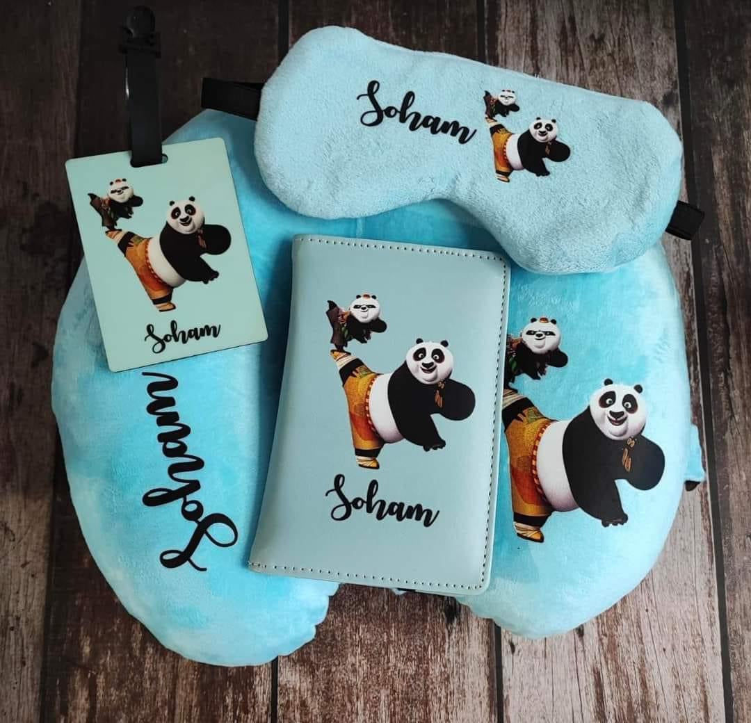 Travel in style with our personalized travel set combo. The set includes neck pillow, eye mask, passport cover and bag tag. The neck pillow has a fiber filling. The bag tags is mdf base.