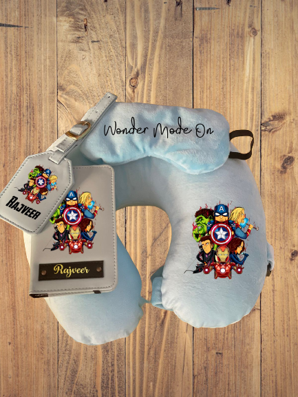 Travel in style with our personalized travel set combo. The set includes neck pillow, eye mask, passport cover and bag tag. The neck pillow has a fiber filling. The bag tags is leather base.